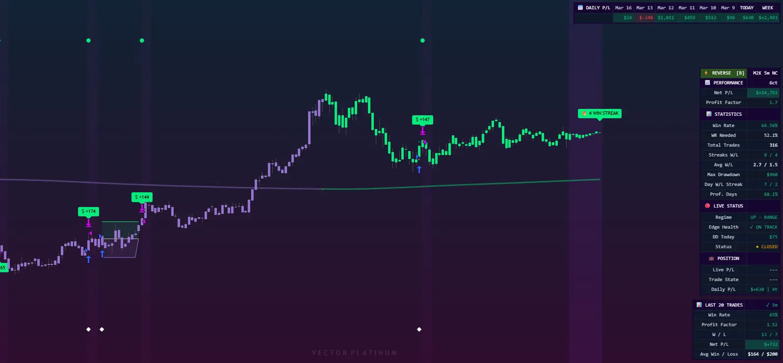 Vector Platinum doesn't ask you to interpret patterns or trust your instincts on a live position. It codifies a systematic edge into a single, deployable Pine Script that runs on TradingView, fires webhooks to your broker, and executes while you do other things. The strategy is the discipline. You just have to let it run.
